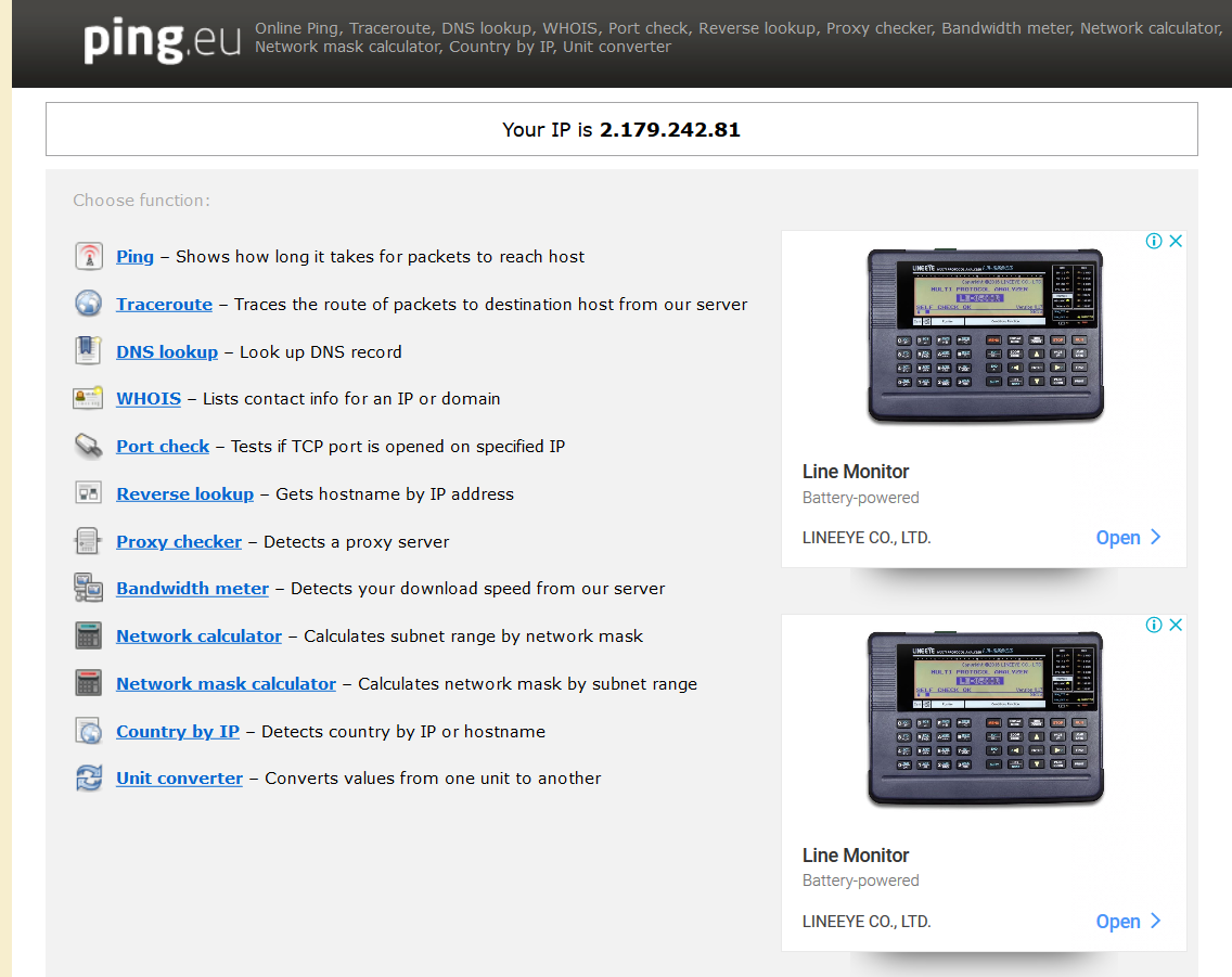 یکی از روش های کاربردی برای مشاهده آی پی اینترنتی که با آن در حال وبگردی هستیم استفاده از سایت ping.eu می باشد، استفاده از این سایت بسیار آسان است و کافیست به این سایت ورود کنید که در بالای سایت آی پی شما نمایش داده خواهد شد،مطابق تصویر زیر: