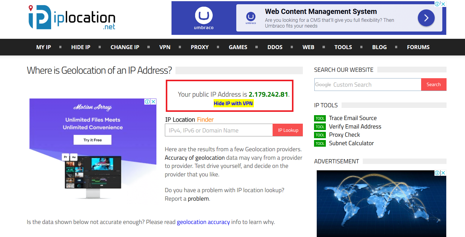 اما برای یافتن ای پی اینترنت خود سایت های بسیار دیگری را هم میتوان پیشنهاد داشد به مانند iplocation.net که این سایت هم دقیقا مانند سایتی است که در بالا ذکر کردیم و پس از ورود به سایت ای پی شما به نمایش درخواهد آمد.(مانند تصویر زیر).