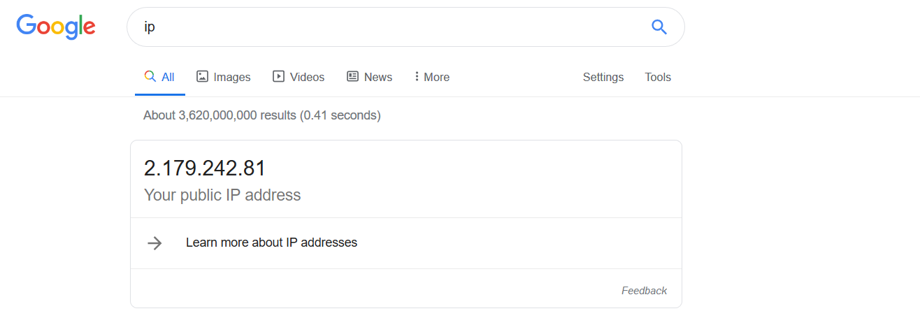 و همچنین سایت های بسیاری دیگر وجود دارد، اما در ادامه میخواهیم همین قابلیت را روی گوگل برای شما نمایش دهیم که چگونه توسط گوگل میتوانید آی پی اینترنت سیستم خود را بدست آورید، کافی است وارد سایت گوگل google.com شوید و سپس عبارت ip را مطابق تصویر زیر در کادر جستجوی گوگل وارد نمایید و اینتر بزنید تا آی پی اینترنت شما را نمایش دهد.