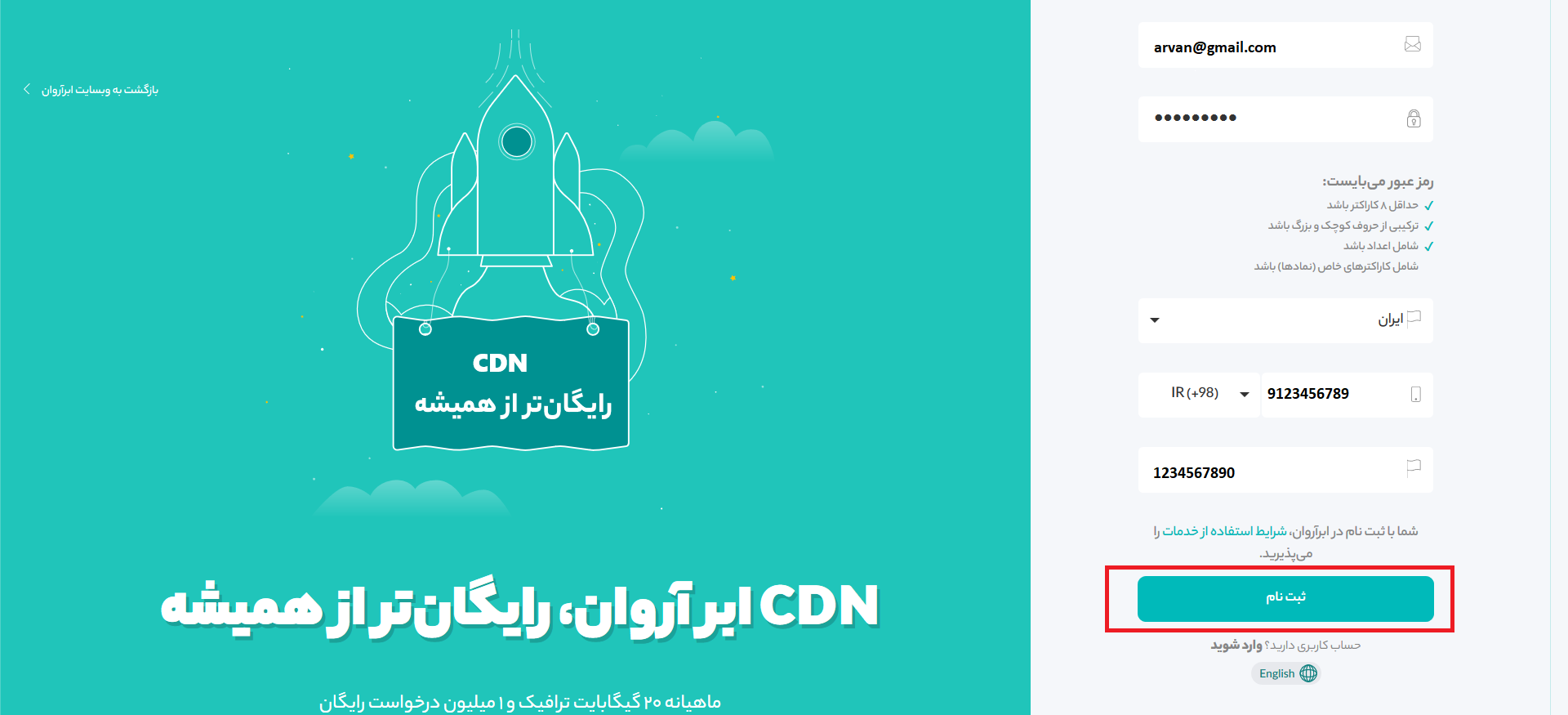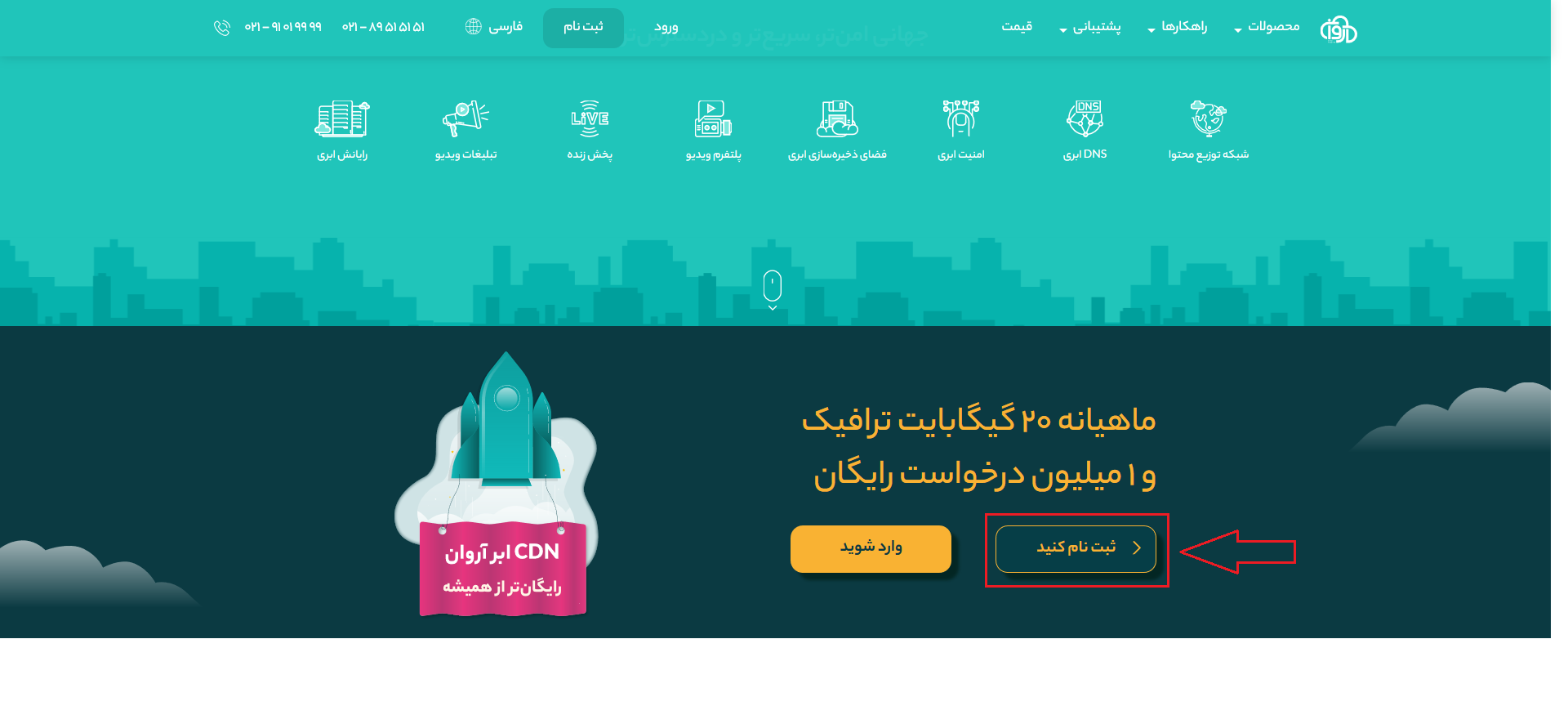 جهت استفاده از سرویس رایگان آروان کلاد ابتدا با کلیک روی لینک زیر وارد سایت مربوطه شده و به عضویت درآیید.(مطابق تصویر زیر.)