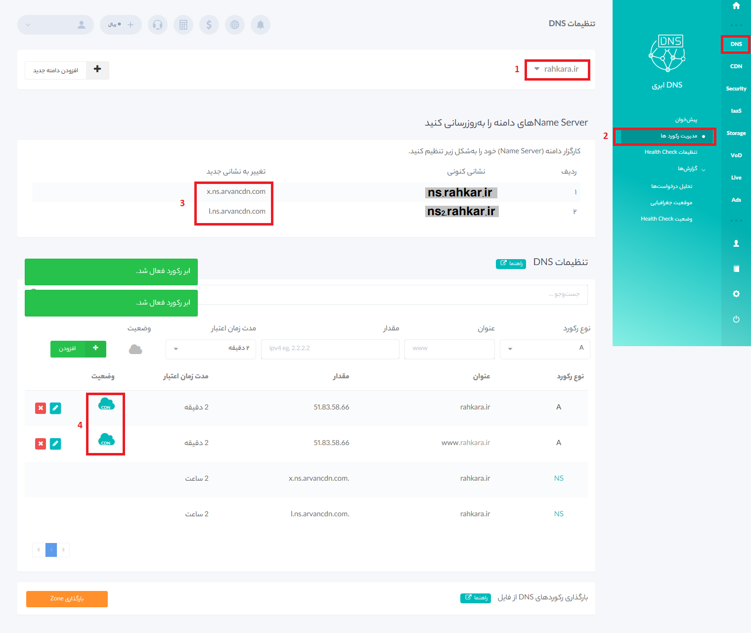 در این مرحله اطلاعات دامنه شما توسط سرویس آروان دریافت می شود. دوباره به بخش DNS وارد شوید و مطابق تصویر زیر: