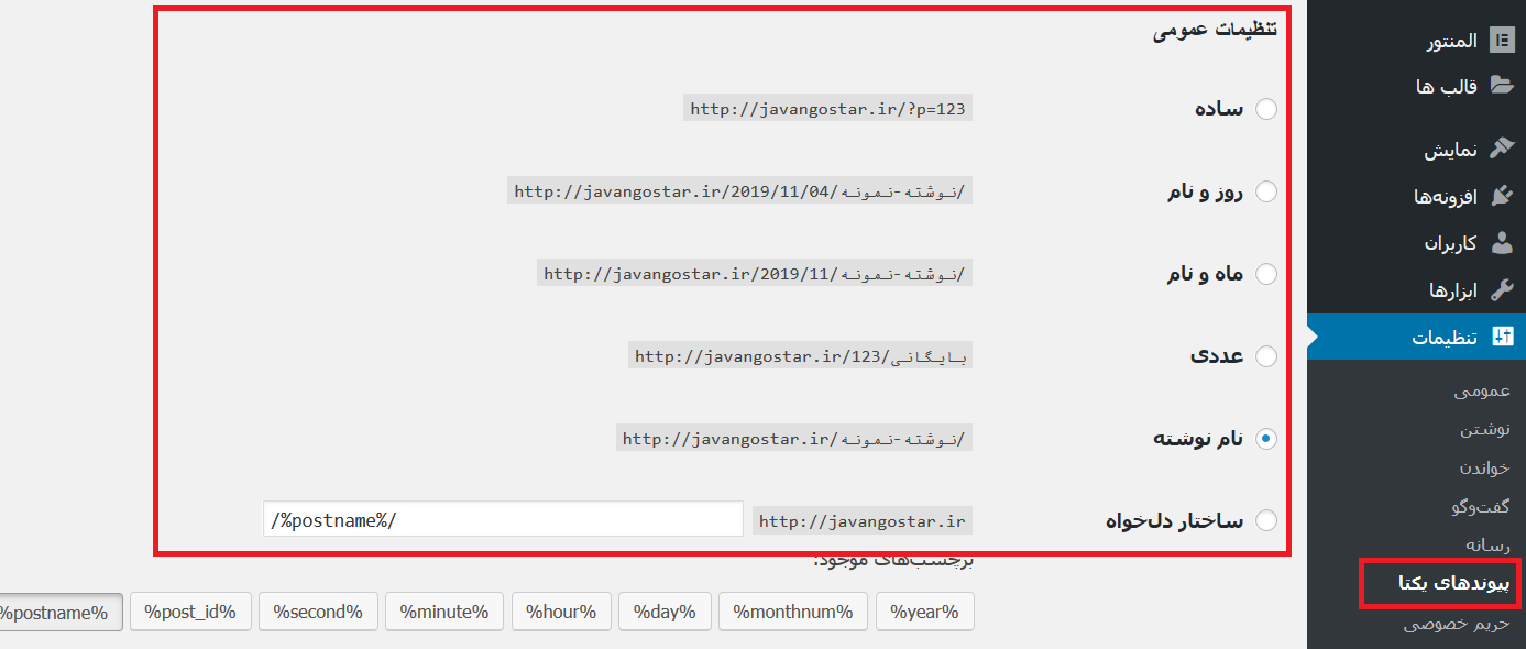 گاها ممکن است آدرس سایت خود را در مرورگر وارد نمایید و پس از اینتر زدن به جای اینکه محتویات وب سایت خود را مشاهده کنید خطایی اعصاب خورد کن بنام not found 404 برای شما نمایش داده شود که یکی از ابتدایی ترین راه های برسی و حل آن مراجعه به تنظیمات ادمین وردپرس و بخش پیوند های یکتا می باشد، در این بخش مانند آنچه در تصویر زیر مشاهده میکنید پیوند یکتا تنظیم شده سایت خود را به نوع دیگری تغییر دهید که احتمالا با انجام اینکار مشکل خطای 404 وردپرس سایتتان رفع خواهد شد.