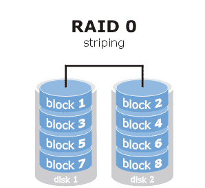RAID 0: در این سطح، اطلاعات به بلوکهایی با اندازههای مساوی تقسیم و هر بلوک به یک دیسک منتقل میگردد. به عنوان مثال اطلاعات به بلوکهای A و B با اندازههای مساوی تقسیم و به دیسکها منتقل میشوند. این روش اغلب توسط تکنیک striping استفاده میگردد و باعث افزایش سرعت خواندن و نوشتن اطلاعات میشود.