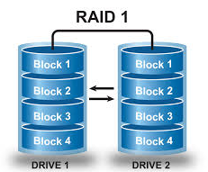 RAID 1: این نوع RAID با نام Mirroring نیز شناخته میشود و اطلاعات یکسان بر روی چندین دیسک نوشته میشود. در این روش حداقل دو دیسک لازم است که یک کپی از اطلاعات بهصورت مجزا در هر دیسک ذخیره میشود. در این حالت کارایی خواندن اطلاعات از هر دو دیسک افزایش پیدا میکند و میتوان اطلاعات را همزمان از هر دو دیسک خواند. همچنین کارایی عمل نوشتن همانند حالتی میباشد که فقط یک دیسک بر روی سیستم وجود دارد.