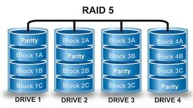 RAID 5: در این سطح از RAID حداقل به ۳ دیسک نیاز است. همانند RAID 1 اطلاعات بهصورت Mirroring در دیسکها ذخیره میشود. همچنین یک کد parity در بین دیسکها پخش میشود که باعث افزایش کارایی میگردد و در هنگام بروز مشکل میتوان اطلاعات از دست رفته را توسط آن بازیابی کرد. در مقایسه با RAID 1 این سطح، سرعت کمتری در نوشتن اطلاعات دارد. زیرا زمانی هم برای نوشتن اطلاعات parity مورد نیاز است.