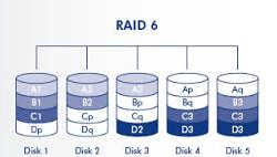 RAID 6: تا حدودی مشابه RAID 5 میباشد، با این تفاوت که دادهها را با استفاده از تکنیک striping به بخشهایی تبدیل کرده و دو مجموعه از اطلاعات parity را برای هر بلوک داده ذخیره میکند.